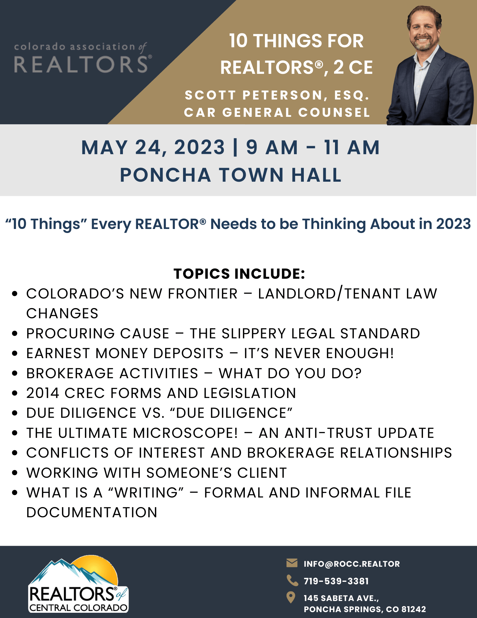 Join CAR General Counsel, Scott Peterson for his most in-demand class as he navigates the legal and regulatory considerations impacting REALTORS® in 2023. REALTORS® who attend the training with attendance verification will receive two continuing education credits.